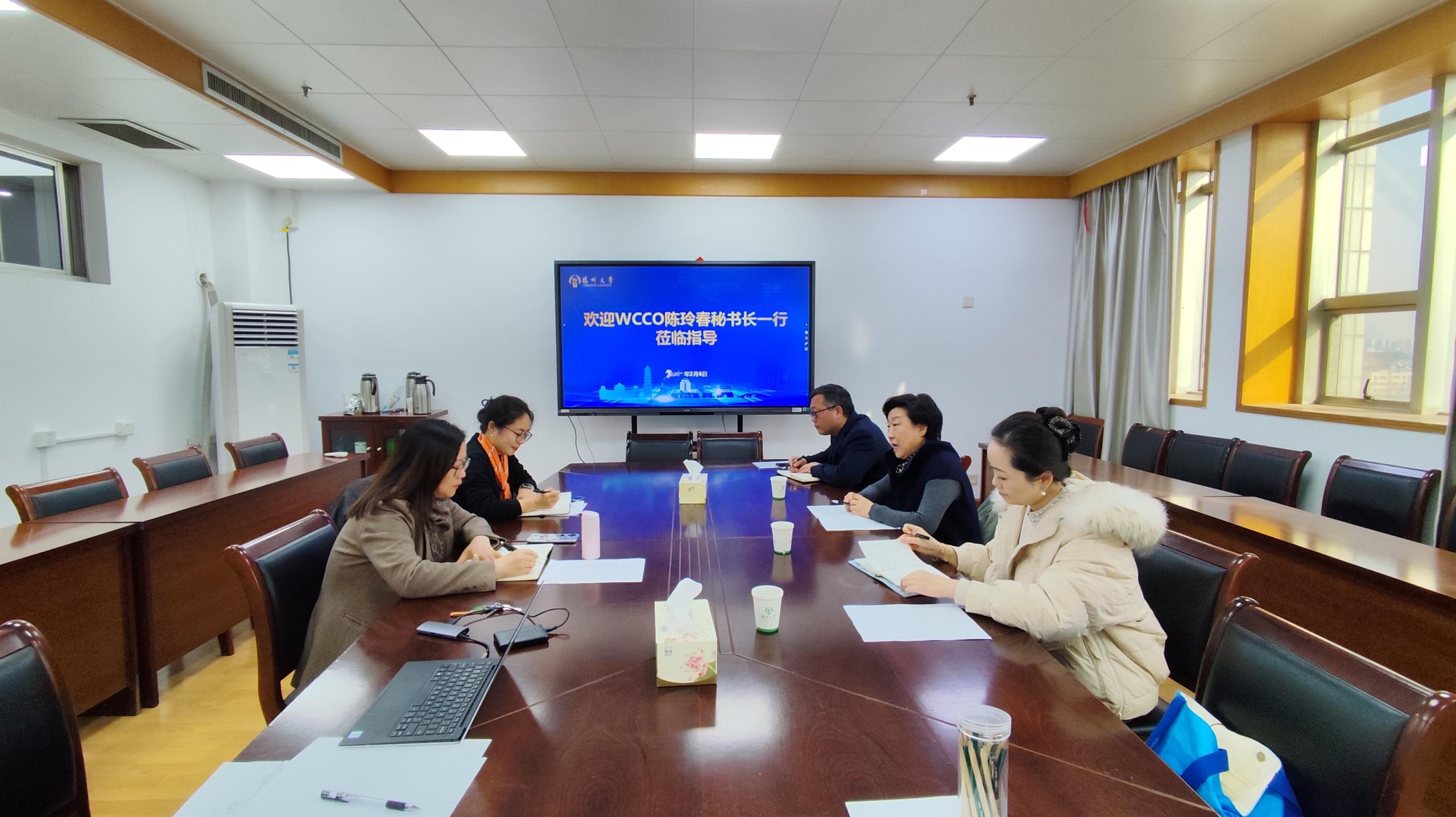 2026年2月5日,世界运河历史文化城市合作组织(WCCO)秘书长陈玲春一行访问扬州大学国际合作与交流处,双方围绕2026年度合作重点进行了深入交流。国际处处长张吟及相关工作负责同志出席会谈。